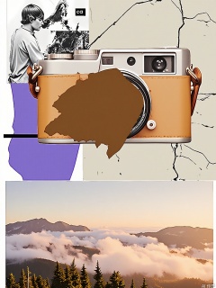 PTYS, Photograph of a mixed media collage, presenting a close - up of a vintage camera with a leather strap, partially covered by a large brown stain. The background consists of a grayscale picture of a street artist at work, a purple section with a white "c" and the text "dream big" in black, and a cracked, plaster - textured wall. The collage also has a section of a forest at dawn with mist rising from the ground. The overall composition is diverse and layered, blending various textures and hues.