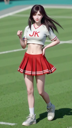 The white sports top paired with a red mini skirt sways gently with her movements, revealing her long legs. Her sports socks and high-top sneakers look both dynamic and full of energy. Her expression is sunny and confident, her eyes revealing a passion for sports, as if she had just finished a physical activity.