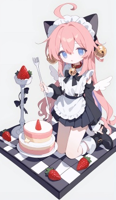 1girl,long hair,solo,bangs,wings,detached sleeves,very long hair,skirt,hair ornament,food,pleated skirt,apron,cake,black skirt,bell,blue eyes,star (symbol),pink hair,simple background,full body,fruit,kneeling,black footwear,strawberry,tail,ahoge,boots,multicolored hair,hair between eyes,striped,mini wings,horns,looking at viewer,cat ears,tail ornament,angel wings,collar,animal ears,ribbon,holding,cat tail,jingle bell,white apron,bow,grey background,shirt,long sleeves,parted lips,cake slice,white wings,cat girl,black bow,object on head,<lora:6.1:0.8>,, score_9,score_8_up,score_7_up,Expressiveh,rating_safe,(masterpiece, best quality)