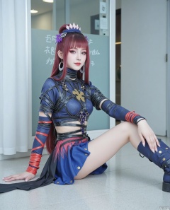 Wearing a tight fitting dark blue short top on her upper body, the material seems to have texture, resembling leather texture, outlining her graceful figure curve. The interlocking metal buckles and black straps on the clothes not only add a cool punk style, but also create a visual effect of restraint and strength coexisting. What is particularly eye-catching is that one arm is wrapped with a bright red strap, forming a sharp contrast with the overall cool tone, while the black strap on the other arm echoes it, showing a unique design sense.
