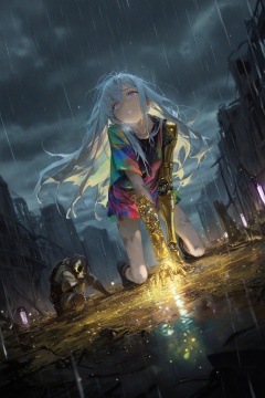 masterpiece,best quality,amazing quality,very aesthetic,absurdres,newest,in the style of fashion photography,light particles,cinematic lighting,Visual impact,sharp focus,Emotionalization,depth of field,dynamic pose,dutch angle,extreme aesthetic,scenery,(dino_(dinoartforame):0.5),(yoneyama mai:0.5),(Yomu:0.3),(quasarcake:0.5),(wlop:0.5),1girl,the girl is in the ruins,the terrible blizzard cover the ground,breathing fast,hot,shivering,injured,one hand covering the other,mechanical arm,steampunk,gold_skin,colorful clothes,dusty appearance,despair,looking at the sky,clouds,rain,rain dripping on the face,cyberpunk,dirty,broken,silver hair,very long hair,silver hair glowing metallic,hair exploding,