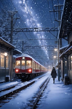 masterpiece,best quality,amazing quality,very aesthetic,absurdres,newest,1girl,solo,standing,outdoors,sky,from_behind,coat,night,ground_vehicle,building,night_sky,scenery,snow,1other,walking,snowing,road,dark,winter,power_lines,lamppost,street,train,train_station,railroad_tracks,vanishing_point,