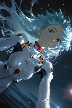 masterpiece,best quality,amazing quality,very aesthetic,absurdres,newest,in the style of fashion photography,light particles,cinematic lighting,Visual impact,sharp focus,Emotionalization,impactful picture,lens flare,depth of field,dynamic pose,dutch angle,extreme aesthetic,(dino_(dinoartforame):0.5),(yoneyama mai:0.5),(Yomu:0.3),(quasarcake:0.4),(wlop:0.3),1girl,maomao \\(kusuriya no hitorigoto\\),plugsuit,pilot suit,white bodysuit,looking at viewer,head tilted,light blue long hair,hair blowing in the wind,(intricate details),(dynamic angle),fluffy hair,air bangs,