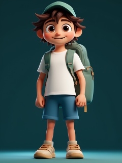 miluo_3d,3D, A lively CGI cartoon of a young lad with light brown skin, big brown peepers, and curly dark hair. He's rocking a green cap, white tee, blue shorts, and beige kicks, with a green backpack. The background is a dark teal gradient.<lora:miluo丨3D 1.3:1>