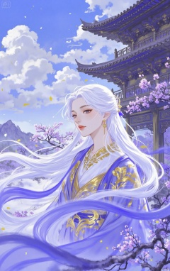 1girl, solo, long hair, jewelry, upper body, white hair, earrings, outdoors, sky, day, cloud, tree, blue sky, chinese clothes, building, architecture, east asian architecture, hanfu,Purple Theme