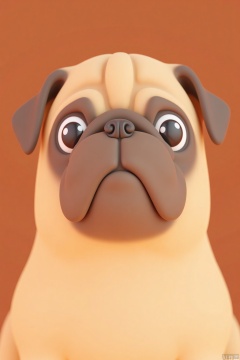 A close-up of a cartoon-style pug with soft pastel fawn fur and smooth, plastic-like wrinkles, rendered against a gradient of warm brown and beige. The pug has simple, rounded shapes and a slightly grumpy, yet endearing expression. Focus on the texture and detail of the wrinkles.