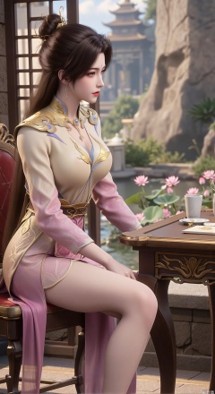 (masterpiece, best quality:1.2),1girl, solo, Ancient princess's boudoir with bright color palette, Hanfu-clad maiden sitting by latticed window desk in romantic daydreaming posture, view of classical Chinese garden through window showcasing lotus pond filled with blooming pink and white lotuses, delicate ink-wash painting style, interior featuring rosewood furniture with mother-of-pearl inlay, silk curtains fluttering in breeze, porcelain stationery set on desk, distant view of curved bridges and pavilions in garden, ultra HD rendering with crisp details on embroidered garments and translucent lotus petals,,(huge breasts:2.99),(full breasts:2.89),