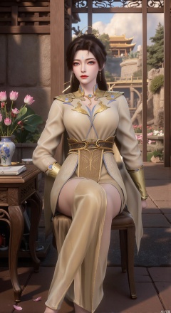 (masterpiece, best quality:1.2),1girl, solo, Ancient princess's boudoir with bright color palette, Hanfu-clad maiden sitting by latticed window desk in romantic daydreaming posture, view of classical Chinese garden through window showcasing lotus pond filled with blooming pink and white lotuses, delicate ink-wash painting style, interior featuring rosewood furniture with mother-of-pearl inlay, silk curtains fluttering in breeze, porcelain stationery set on desk, distant view of curved bridges and pavilions in garden, ultra HD rendering with crisp details on embroidered garments and translucent lotus petals,,(huge breasts:2.99),(full breasts:2.89),