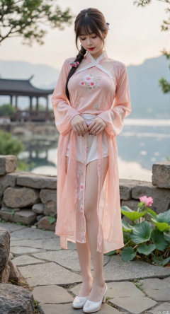 (Chinese ink painting:1.4), flowing silk transparent hanfu with peony embroidery, transparent pao,(floating ink ribbons:1.3), misty mountain landscape, moon gate ruins, (glowing calligraphy stockings:1.2), jade-inlaid shoes reflecting lotus ponds, low angle perspective, 18-year-old girl, super long legs, (Song dynasty aesthetics:1.3), delicate pearl hairpin,