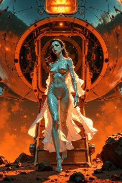 otherworldly humanoid with an ethereal,porcelain complexion descends from a sleek,metallic spacecraft that has landed with precision on a desolate landscape at dusk. As the ramp of the vessel lowers,she steps out into an extraterrestrial environment shrouded in an orange-hued mist,her slender form bathed in an intense,pulsing light emanating from within the ship's hull,casting long shadows across the barren terrain behind her. Her features are finely detailed and delicately sculpted,as if crafted by a skilled artisan,with sharp cheekbones,full lips,and eyes that hold a captivating,unearthly allure,fringed by thick,dark eyelashes and eyebrows. Her gaze seems to be drawing energy from the surrounding environment,as she surveys her surroundings with an unyielding determination burning within her very being. A flowing,crystalline gown adorns her physique,its intricate patterns shimmering in response to every movement of hers,infusing the desolate landscape with a hint of enchantment and subtle mystery as light dances across its reflective surface,bathing everything in its path with a kaleidoscope of colors that reverberate with each gentle sway,