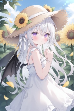 quality,amazing quality,very aesthetic,absurdres,1girl,loli,solo,flower,hat,long hair,dress,wings,sunflower,outdoors,white dress,purple eyes,day,looking at viewer,white ribbon,bare shoulders,sky,ribbon,very long hair,yellow flower,hair ribbon,cloud,petals,hair between eyes,blue sky,bangs,sun hat,bow,blush,standing,hat flower,white bow,from side,sleeveless dress,straw hat,sleeveless,looking to the side,demon wings,bracelet,closed mouth,bat wings,white hair,brown headwear,hands up,