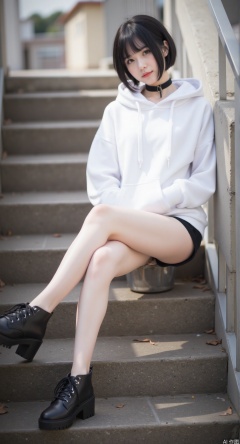 1girl, solo, looking at viewer, short hair, black hair, standing, full body, outdoors, shorts, choker, hood, black footwear, hoodie, black choker, hood down, cross-laced footwear, stairs, hands in pockets, white hoodie,legg up,sitting,foot focus