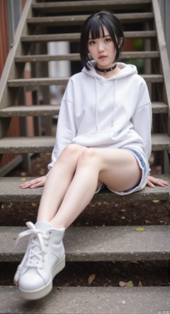 1girl, solo, looking at viewer, short hair, black hair, standing, full body, outdoors, shorts, choker, hood,  hoodie, black choker, hood down, cross-laced footwear, stairs,  white hoodie,legg up,sitting,foot focus