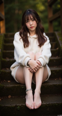 1girl, sitting on mossy stone steps, legs crossed with calves pressed together, feet aligned symmetrically, toes softly arched, toned legs, oversized ivory hoodie, oxidized silver anklet, chocolate brown waves framing jawline, eyes half-lidded, golden hour backlight, 85mm lens bokeh, foot focus 1.1x, subtle foot creases, smooth skin with amber undertones, shadow gradient on legs, color palette ivory/sage/gold, background blurred forest green