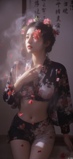 A young Asian woman wearing a flower wreath,An Acrylic style painting that is expressive, gives it a dynamic and emotional quality.a woman with a ethereal red and blue mist surrounding her body. The mist creates a dramatic and surreal effect. A red flower, that is blooming, covering one eye, attached to the face. The woman has a cold aesthetic, complimented by her white hair. Anime art of woman draped in shadows with a lighting that enhances her sexy unique features. with a black kimono adorned with flowers. The background is blurred The background is a wall with Chinese characters written on it creating a stark contrast to the woman's outfit. filled with red rose petals.