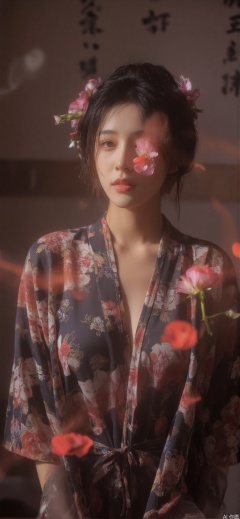 A young Asian woman wearing a flower wreath,An Acrylic style painting that is expressive, gives it a dynamic and emotional quality.a woman with a ethereal red and blue mist surrounding her body. The mist creates a dramatic and surreal effect. A red flower, that is blooming, covering one eye, attached to the face. The woman has a cold aesthetic, complimented by her white hair. Anime art of woman draped in shadows with a lighting that enhances her sexy unique features. with a black kimono adorned with flowers. The background is blurred The background is a wall with Chinese characters written on it creating a stark contrast to the woman's outfit. filled with red rose petals.