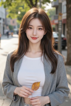 a young woman standing on the street. She is dressed in a white top and grey jacket, holding a brown-yellow leaf in her hand. Her hair is brown and falls in loose waves. She appears to be in a good mood, smiling and looking at the camera. The background shows a street lined with buildings and trees, with sunlight filtering through the leaves, creating a warm atmosphere. In the distance, one can see some pedestrians and bicycles.