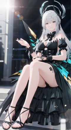 liv(PGR),1girl, solo, long hair, breasts, looking at viewer, bangs, dress, cleavage, hair between eyes, bare shoulders, medium breasts,short sleeves, grey hair, detached sleeves, puffy sleeves, black dress, puffy short sleeves, grey eyes, black bow, tattoo, halo,soft gentle eyes,gentle expression,parted lips,light smile,depth of field, light particles, lens flare, masterpiece,best quality,((artist:reoen),(artist:fuzichoco),(artist:atdan),(artist:torino_aqua:0.5),year 2024:0.5),(artist:omone_hokoma_agm:0.8), 2d, anime,full body,Sandals,toes,floating,