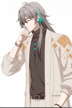 solo,(white background:1.2),simple background,su_honkai_3rd,anime_style,long hair,1boy,male focus,jewelry,closed mouth,closed eyes,grey hair,necklace,bracelet,sweater,turtleneck,multicolored hair,hair between eyes,coat,jacket,earrings,streaked hair,belt,hair stick,hair ornament,pants,black shirt