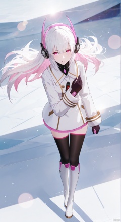 1girl,liv-eclipse/(punishing gray raven), solo, long hair, bangs, thighhighs, gloves, long sleeves, white hair, boots, black gloves, black thighhighs, pink eyes, headgear, headphones, white footwear, white coat, pink inner hair,soft gentle eyes,gentle expression,parted lips,light smile,depth of field, light particles, lens flare, masterpiece,best quality,((artist:reoen),(artist:fuzichoco),(artist:atdan),(artist:torino_aqua:0.5),year 2024:0.5),(artist:omone_hokoma_agm:0.8), 2d, anime,full body,floating,from above