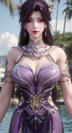 SFW,(masterpiece:1.2),best quality,absurdres,masterpiece,original,extremely detailed wallpaper,perfect lighting,1girl,solo,looking at viewer,(cowboy_shot:1.3),long hair,high heels,blurry background,depth of field,motion blur,(long dress:1.23),china_dress,chinese_style,bare shouders,crystal_earrings,headpiece,hair_tie,chest_jewel,gem,necklace,jewelry,in summer,day,outdoors,nature,garden,,(standing,Seaside, beach, sailboat, coconut trees,flowers:1.59),(huge breasts:2.99),(full breasts:2.99),
