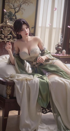 (masterpiece, best quality:1.2),Ancient Chinese boudoir scene, Hanfu-clad maiden lying sideways on an intricately carved wooden bed, soft natural light filtering through sheer silk curtains, satin bedding with delicate sheen, detailed traditional Chinese Gongbi painting style, subtle celadon color palette, background featuring vintage dressing table and embroidered screen, falling plum blossom petals near window and wispy smoke from bronze incense burner, 8K resolution with intricate fabric draping and wood grain textures,,(huge breasts:2.99),(full breasts:2.89),