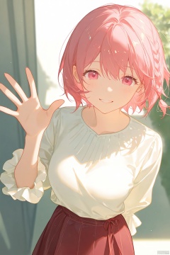 solo,female,oval face,skirt,pink hair,pink eyes,short hair,bangs,side braided ponytail,smile,cheongsam,arm_behind_back,waving,