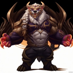 solo, looking at viewer, 1boy, full body, furry,male focus, horns, teeth, pants, muscular, muscular male, claws, colored sclera,character:Volibear, bear boy