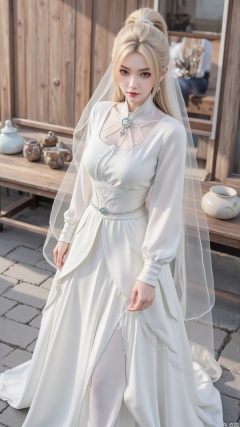 1girl, white wedding dress,looking at viewer, mischevious smile, perfect body, scenery, sharp focus, best quality, masterpiece, detailed outfit, illustration, perfect eyes, finely detailed beautiful anime eyes, realistic skin, intricate details, best lighting, depth of field, ultra high resolution, cowboy_shot, bride