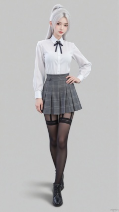 1girl, solo, long hair, breasts, looking at viewer, bangs, skirt, shirt, white hair, long sleeves, bow, medium breasts, closed mouth, school uniform, standing, full body, white shirt, hair bow, pantyhose, pleated skirt, shoes, striped, collared shirt, bowtie, grey background, black footwear, lips, plaid, black pantyhose, dress shirt, plaid skirt, grey skirt, thighband pantyhose, shirt tucked in
