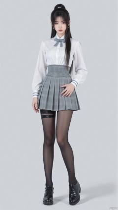 1girl, solo, long hair, breasts, looking at viewer, bangs, skirt, shirt, long sleeves, bow, medium breasts, closed mouth, school uniform, standing, full body, white shirt, hair bow, pantyhose, pleated skirt, shoes, striped, collared shirt, bowtie, grey background, black footwear, lips, plaid, black pantyhose, dress shirt, plaid skirt, grey skirt, thighband pantyhose, shirt tucked in