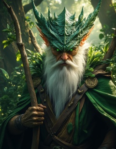 A photograph of a fantasy character, an old wise wizard with a long white beard, wearing a leafy crown and holding a wooden staff. The background is a dense, lush forest with green foliage and dappled sunlight. The wizard's eyes are glowing green, and he has a serious, wise expression. The image is high quality and detailed, with a magical, mystical atmosphere.,<lora:山海lora:1>,