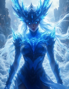 A stunning digital illustration of a fierce warrior woman with glowing blue eyes and intricate blue and white armor. She wears a helmet adorned with sharp, icy horns, and her long, flowing white hair cascades down her shoulders. The background is a swirling mix of icy blue and white clouds, creating a sense of movement and power. The armor is detailed with frosty patterns, and she stands confidently, exuding strength and determination. The artwork is in a fantasy style, with a focus on cool tones and dynamic lighting.,<lora:山海lora:1>,