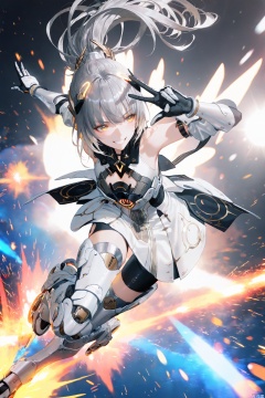 1girl, solo,nanami/punishing gray raven,grin naughty,peace sign,long hair, bangs, thighhighs, dress, bare shoulders, yellow eyes,brown crossed pupils, ponytail, grey hair, armor, gauntlets,skates, mechanical legs, roller skates,Galloping, sparks flying,Slider pose,depth of field, light particles, lens flare, (artist:quasarcake:0.8),extreme aesthetic,(wlop:0.6), wanke,rella,wanke,masterpiece,best quality,good quality,newest ,year 2024, year 2023, very aesthetic,absurdres,Visual impact, A shot with tension, ultra-high resolution,32K UHD,sharp focus,best quality,masterpiece,Emotionalization masterpiece, unconventional supreme,masterful details,with a high end texture,in the style of fashion photography, (Visual impact:1.2),giving the poster a dynamic and visually striking appearance,impactful picture,offcial art,colorful ,splash of color, movie perspective, masterpiece,best quality,amazing quality,very aesthetic,absurdres,best quality,newest,from above