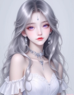 A digital painting of a young woman with long, wavy silver hair and a delicate, ethereal face. She has large, expressive purple eyes and a small, ornate nose. She is wearing a white, off-the-shoulder dress with lace detailing and a sparkling choker. The background is a soft, gradient gray, and the lighting is soft and diffused, creating a dreamy atmosphere. The style is realistic with a touch of fantasy. The woman has a serene, almost melancholic expression. The artwork is signed "Daisuke '23" in the bottom right corner.,<lora:动漫美女·3 (1):1>,