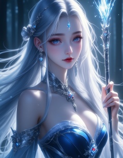 A stunning digital painting of a woman with long, flowing silver hair and piercing blue eyes. She wears an elaborate, ethereal gown adorned with intricate silver embroidery and a large, sparkling gemstone at the center of her chest. The dress features a low neckline, revealing her ample cleavage. She holds a staff with a glowing blue crystal at the top. Her skin is pale, almost luminescent, and she has a serene, otherworldly expression. The background is a dark, mystical forest with a soft, moonlit glow. The art style is detailed and realistic, with a fantasy theme.,<lora:动漫美女·3 (1):1>,