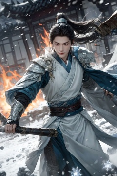 1boy,one man wears hanfu,with determined expression,flowing black hair tied with silver ribbon,creating energy trails,battlefield with shattered shields and burning war drums,icy blue energy aura around warrior,frozen mud splashes under horse hooves,dynamic snowflakes mixed with ash particles,cinematic cold metallic lighting with rim highlights,traditional Chinese battle banners torn by wind,ultra-realistic textile textures,Unreal Engine 5 ray tracing,8K IMAX film grain,Correct human body structure, correct proportion