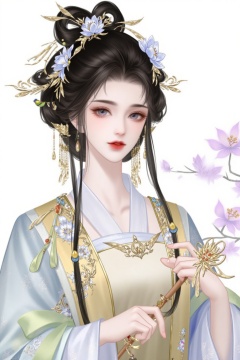 gufeng_style,wenyou,gufeng_style,female,solo,black hair,hair accessories,long sleeves,hug,jewelry,beautiful big eyes,upper body,flowers,earrings,wide sleeves,hair bun,makeup,Chinese clothing,insects,plants,hand fan,red lips,updo,Hanfu,Color temperature:-100,messy hair,impactful visuals Perfect composition,she has delicate facial features and perfect body proportions,with an anime style aesthetic. The character design is very detailed Contrast,layered colors,vivid colors,contrast,official art,movie perspective,very beautiful,depth of field,crazy interaction between light and shadow,highly refined,ultra-high resolution,32K UHD,clear focus,best quality,masterpiece,emotional,non-traditional masterpiece,exquisite details,gentle atmosphere,high-end texture,Chinese New Year,festive atmosphere,Gorgeous Hanfus,Simple background,white background,