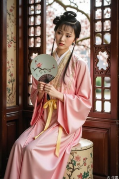 Under the carved window frame, a woman in a pink skirt was sitting sideways on the embroidered pedestal. The skirt is made of delicate silk, the upper skirt is embroidered with exquisite crabapple flower patterns, and the color is beautiful. The lower skirt is a pleated skirt in the same color, with fine and neat pleated ones. A goose-yellow silk ribbon is tied around her waist, a gentle jade pendant is hung on the belt, a woman holding a round fan, and an orchid is painted on the fan. She tilted her head slightly, her eyes were gentle, staring at the spring scenery outside the window, her beautiful eyebrows were frowning, as if she was thinking about her thoughts, and her hair was softly hanging on her shoulders, showing the softness and shyness of a classical lady. A BOW-daiyu