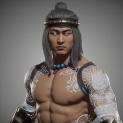 ,solo,(grey background:1.2),simple background,liu_kang,Mortal_Kombat_11,bead necklace,pearl necklace,back tattoo,white hair,topless male,pectorals,stomach tattoo,shoulder tattoo,full-body tattoo,bare pectorals,arm tattoo,glowing,beads,jewelry,blue eyes,muscular,ankle wrap,bandaged leg,tattoo,armor,choker,logo,earrings,manly,pants,necklace,belt,jewelry,wrist wrap,fire,flame,arm wrap,long hair,headband,1boy