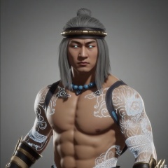 ,solo,(grey background:1.2),simple background,liu_kang,Mortal_Kombat_11,bead necklace,pearl necklace,back tattoo,white hair,topless male,pectorals,stomach tattoo,shoulder tattoo,full-body tattoo,bare pectorals,arm tattoo,glowing,beads,jewelry,blue eyes,muscular,ankle wrap,bandaged leg,tattoo,armor,choker,logo,earrings,manly,pants,necklace,belt,jewelry,wrist wrap,fire,flame,arm wrap,long hair,headband,1boy