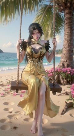 SFW,(masterpiece:1.2),best quality,3d anime style, cg,absurdres,masterpiece,original,extremely detailed wallpaper,perfect lighting,official art, Golden sandy beach covered with vibrant flowers, turquoise waves gently lapping the shore, elegant woman in embroidered qipao swinging on a wooden swing under coconut trees, bright flower clusters spreading from sand to palm tree roots, soft natural light filtering through coconut leaves, ocean breeze lifting hair and qipao hem, high-resolution details showcasing petal textures and silk fabric sheen, ultra-wide angle lens capturing coastline panorama, cinematic color grading with soft focus on the central figure,(huge breasts:2.99),(full breasts:2.99),