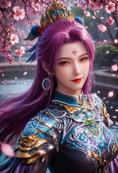 score_9,high detail,best quality,cinematic lighting,volumetric lighting,shiny skin,shiny,1girl,solo,earrings,jewelry,facial mark,forehead mark,long hair,necklace,breasts,purple hair,closed mouth,dress,smile,red lips,beads,hair ornament,realistic,brown eyes,armor,looking_at_viewer,\nBREAK\nfair_skin,white_skin,shiny_skin,Ivory_skin,(looking at viewer:1.1),(cinematic lighting:0.9),(volumetric lighting:0.9),solo focus,large_breasts,(perfect_face:1.2),(perfect_anatomy:1.1),Tranquil garden pond surrounded by cherry blossoms,Vibrant cherry blossom park in full bloom,day,suneate,<lora:QQSponysiyouyouV1:0.8>,<lora:Pony_DetailV2.0:0.8>,<lora:皮肤凹痕:0.1>,
