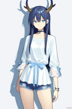 1girl,solo,dark blue hair,hair between eyes,long hair,blue dragon horns,white blouse,straight_hair,hair_downdenim_shorts,lace-trimmed_sleeves,sidelocks,bracelet,stud earrings,light blue eyes,long_sleeves,light blue ribbon,dark blue nail polish,bare_legs,cowboy_shot,choker,simple_background,standing,white_background,shadow,smile,posing,front view,
