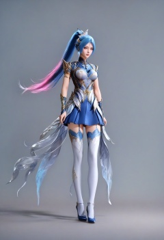 air_skin,white_skin,score_9,<lora:SF_WangQiuErArmor_Pony_Realism2.3-000003:0.7>,dress,hair ornament,blue hair,ponytail,multicolored hair,1girl,breasts,medium breasts,thighhighs,blue skirt,solo,standing,looking at viewer,simple background,full body,high heels,