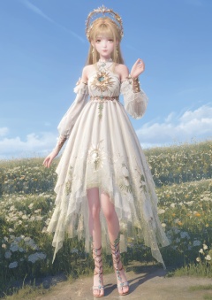 score_10,score_9,score_8_up,score_7_up,1girl,<lora:NikkiCJZF_PonyV1-000004:0.5>,NikkiCJZF,solo,dress,jewelry,standing,earrings,sandals,blonde hair,long hair,white dress,hair ornament,detached sleeves,bare shoulders,in summer,day,nature,flower field,outdoors,sky,Cirrocumulus,looking at viewer,