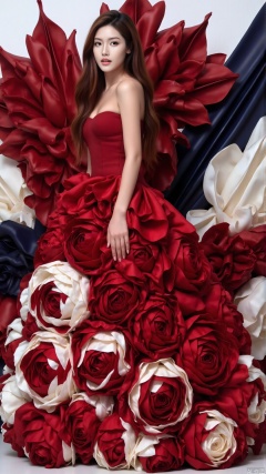 The woman is wearing a red dress with a skirt made of layered red and cream flowers, creating a rich sense of depth. She stands sideways with one hand lightly on her waist, showing an elegant posture. Behind her is a striking, high-contrast background featuring bold splashes of deep crimson and midnight blue, intertwined with sharp, angular lines that create a sense of movement and energy. This dynamic backdrop intensifies the visual impact of the dress, transforming the stylish and modern atmosphere into one that is both dramatic and visually captivating.