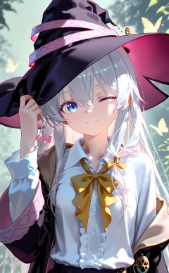 masterpiece,very aware,highres,absurdres,newest,best quality,loli,petite,high quality,chromatic_aberration,//,nyalia style,1girl, witch hat, hat, elaina (majo no tabitabi), shirt, one eye closed, solo, smile, bow, long hair, white shirt, braid, black headwear, collared shirt, yellow bow, yellow bowtie, witch, blue eyes, hand on headwear, skirt, yellow ribbon, looking at viewer, hair between eyes, long sleeves, bowtie, frills, grey hair, bug, closed mouth, open clothes, blush, butterfly, open robe, ribbon, single braid, black skirt, upper body, ;), black robe, off shoulder, robe, hair bow, side braid, neck ribbon, jacket//,<lora:nyalia——【noob】hans:1>,
