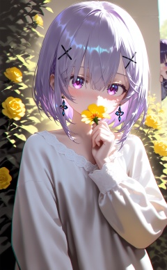 masterpiece,very aware,highres,absurdres,newest,best quality,loli,petite,high quality,chromatic_aberration,//,nyalia style,1girl, solo, flower, peeking out, looking at viewer, hair ornament, hair between eyes, long sleeves, shirt, purple eyes, yellow flower, jewelry, white shirt, upper body, earrings, purple hair, holding flower, holding, short hair, covering own mouth, bush, hiding, hairclip, outdoors, x hair ornament, blush, hand up, covered mouth, bob cut//,<lora:nyalia——【noob】hans:1>,