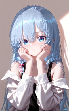 masterpiece,very aware,highres,absurdres,newest,best quality,loli,petite,high quality,chromatic_aberration,//,nyalia style,1girl, solo, blue eyes, blue hair, looking at viewer, long hair, shirt, black **** top, straight hair, hands on own face, **** top, upper body, long sleeves, hands on own cheeks, black shirt, :i, closed mouth, off shoulder, jacket, open clothes, :t, hands up, hair between eyes, signature, white shirt, shadow//,<lora:nyalia——【noob】hans:1>,